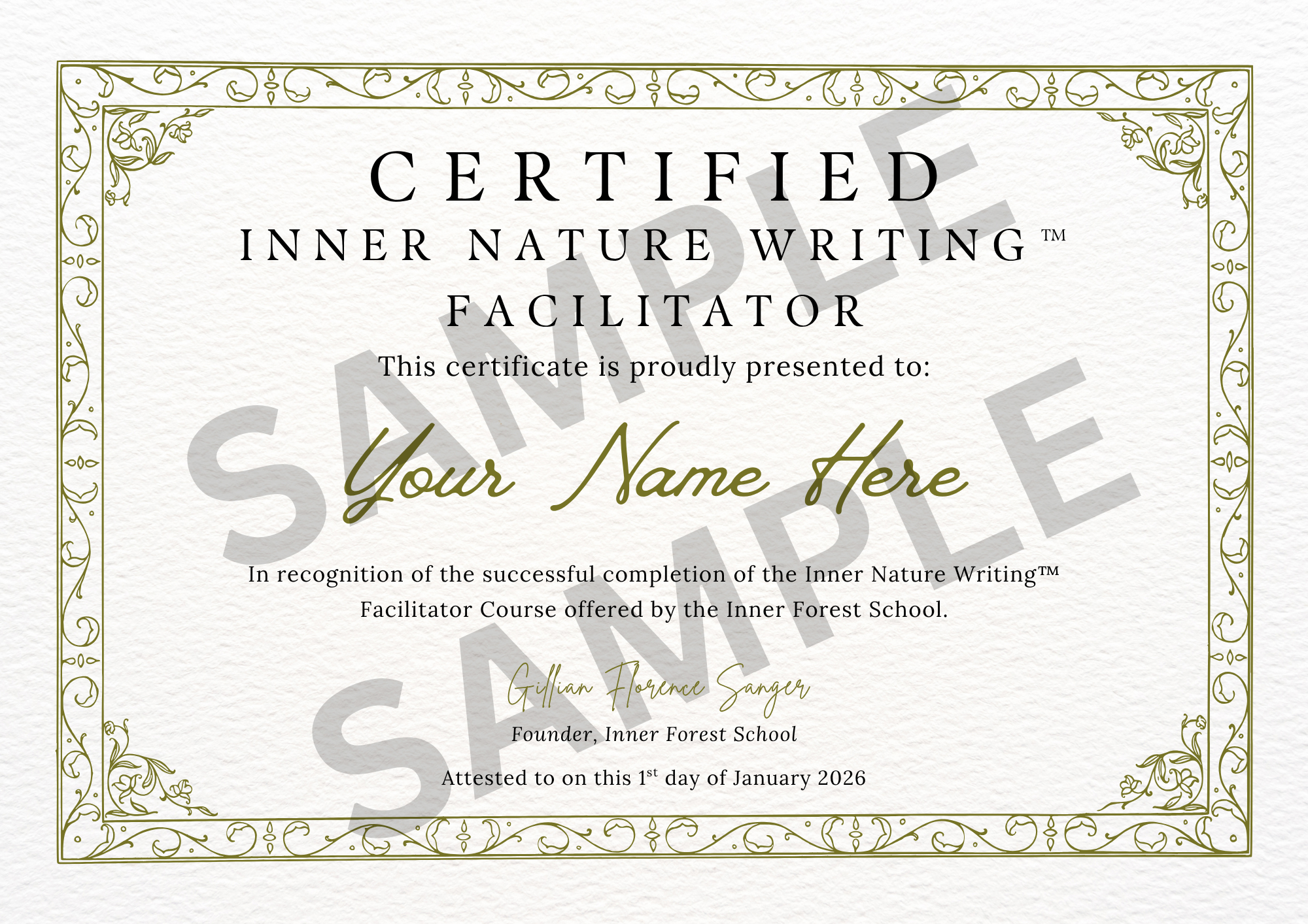 The homework required for certification is as follows: 1) Completing a course workbook that mirrors the on-demand lessons, 2) Submitting reflections of your own experience with the 3 Inner Nature Writing™ sessions offered during the course (one must be attended live), and 3) Two self-assessment forms of you leading this work for others–fellow students, friends, family, or clients, in group or 1:1 sessions. The entire course will take about 25-30 hours to complete, homework included.